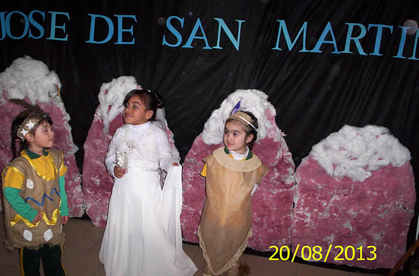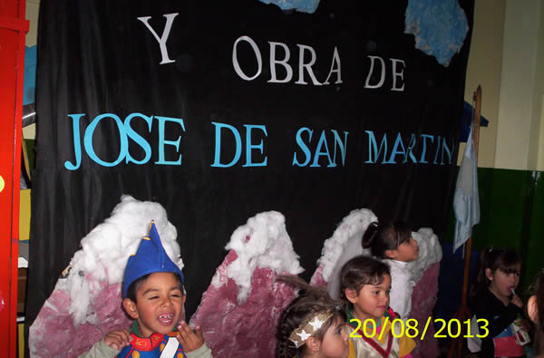 Los alumnos de la I y II sección de ambos turnos (la sala de los hipopótamos y elefantes) representaron y dramatizaron el recorrido de su vida: su familia de origen, su niñez, su viaje a España, su labor patriota, su familia, la preparación del ejército, el cruce de Los Andes y su obra libertadora de los países hermanos.