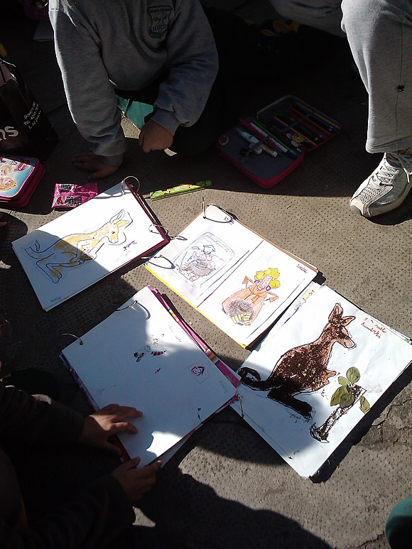 Una vez a la semana usando los libros que tenemos en clase, en este caso “Cuentos a saltos de canguros” de Elsa Bornemann, convertimos el aula o el patio en una BIBLIOTECA, de modo que el contacto con los libros de todo tipo se vaya convirtiendo en una actividad cotidiana.